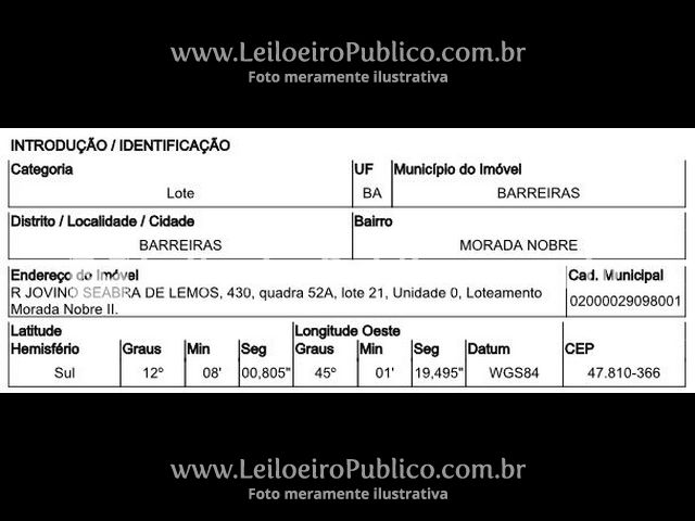 BARREIRAS (BA): TERRENO, 360M2Descrição do Bem:Terreno, 360m2 de área do terreno. IPTU: 02000029098001 Matrícula: 55095 Ofício: 2.Endereço do Bem:RUA JOVINO SEABRA DE LEMOS(ANTIGA AV P 2) N. 430 QD 52-A, LT 21, MORADA NOBRE, Lot Morada Nobre, CEP: 47810366.Considerações Importantes:Número do Bem: 10176986. Edital de Leilão: Caixa Econômica Federal - CEF. Leilão Único de Imóveis Patrimoniais 0040/0324 CPVE/RE.Benefícios Pagos pela Caixa Econômica Federal*:+Imóveis Livres de Débitos: IPTU, ITR e/ou Condomínios.+Assessoramento em Pós-Arremate por Corretor Imobiliário.*A Caixa se responsabiliza pelo(s) pagamento(s) de despesa(s) que recaia(m) sobre o imóvel conforme Item 16 do Edital.Botões dos Documentos do Bem:Condições de PagamentosMatrícula do ImóvelCondições Gerais:A) Bem vendido no estado em que se encontra. B) Lances ofertados são irrevogáveis e irretratáveis. C) Fotos meramente ilustrativas. D) Reservamo-nos o direito de erros de digitação. E) Eventuais débitos que incidam sobre o imóvel, tais como Imposto IPTU, Imposto ITR, Taxas de Condomínio e/ou Pendências Diversas serão da(s) responsabilidade(s) e arcado(s) pela CAIXA da seguinte forma: para as aquisições à vista, todos os débitos gerados até a data do pagamento da compra; para casos de utilização do FGTS, todos os débitos até a data da assinatura do contrato, conforme item 16 do Edital. F) O(a) Arrematante receberá serviços de assessoramentos em pós-venda através corretor e/ou imobiliária que será pago exclusivamente pela CAIXA. G) Aquele(a) que Fraudar ou Tentar Fraudar a Licitação incorrerá em Crime. Portanto, estará sujeito às punições do Código Cívil Brasileiro: artigos 186 e 927 e do Código Penal Brasileiro: Art. 358 - Impedir, perturbar ou fraudar arrematação judicial; afastar ou procurar afastar concorrente ou licitante, por meio de violência, grave ameaça, fraude ou oferecimento de vantagem: Pena - Detenção de 2 (dois) meses a 1 (um) ano além da pena correspondente à violência. Por questões de conformidade com a legislação, ficará registrado a data, hora e seu endereço IP (internet protocol).